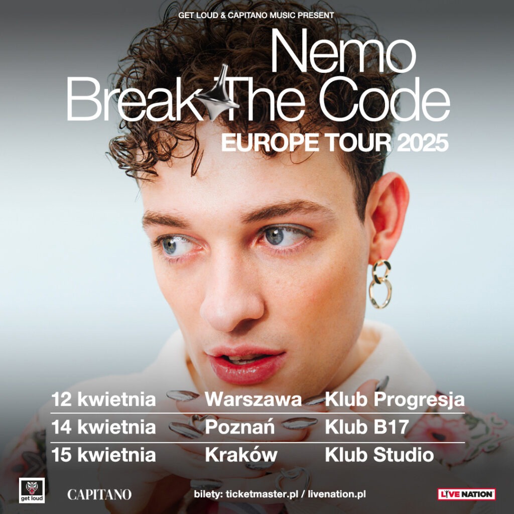 najpiękniejszych rzeczy i nie mogę się doczekać, aby spotkać się ze wszystkimi”. Nemo zdobył serca miłośników muzyki swoim znakomitym występem „The Code” na Konkursie Piosenki Eurowizji 2024 w Malmö w Szwecji. Energetyczne show i charyzma sceniczna Nemo, w połączeniu z unikalnym głosem i ciepłą, sympatyczną postawą, bez trudu oczarowały publiczność i przyniosły Szwajcarii pierwsze zwycięstwo na Eurowizji od 1988 roku (Celine Dion). „The Code” wspina się teraz na międzynarodowe listy przebojów w całej Europie i na świecie. Następnym ważnym punktem w karierze artysty jest nadchodzący sezon festiwalowy. Nemo wystąpi na festiwalach Pride w Madrycie, Barcelonie, Kolonii oraz na różnych letnich. Nowa muzyka jest już w drodze, a europejska trasa koncertowa na wiosnę 2025 roku będzie w sprzedaży od piątku 14 czerwca.